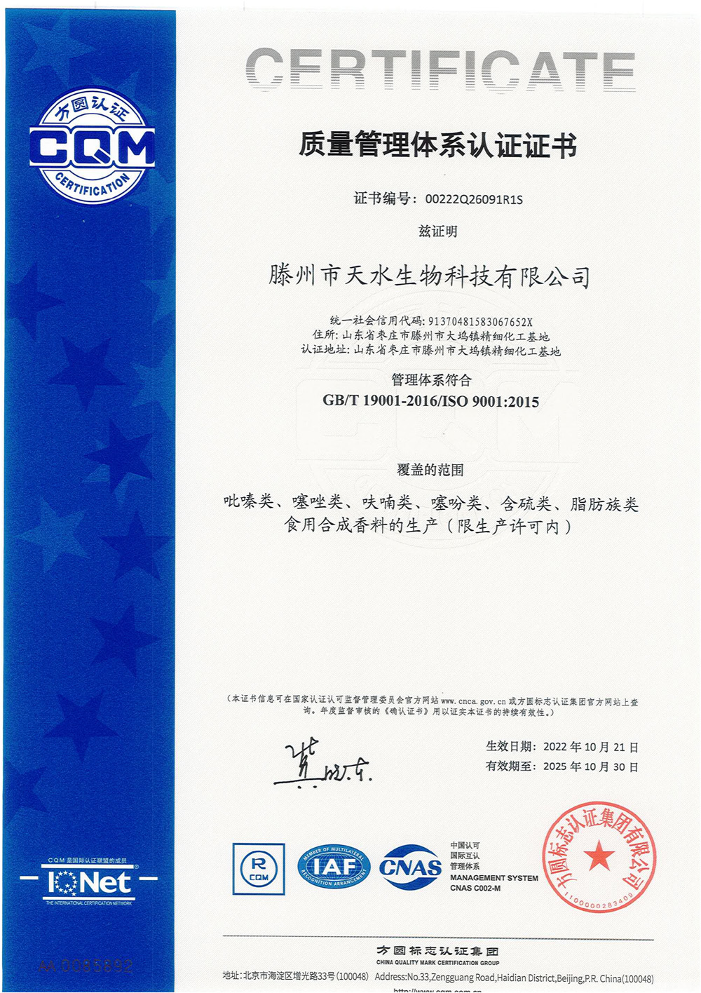 滕州市天水生物科技有限公司成立于2011年9月,是目前國內雜環類合成食品香料、日化香料和醫藥中間體生產經營的綜合性企業。坐落于山東省滕州市生物醫藥產業基地,總投資5000余萬元,占地面積約30000平方米,員工百余人。公司先后被評為高新技術企業、專精特新中小企業、科技型中小企業,建有市級重點實驗室1處,并先后獲得ISO9001質量體系認證、ISO22000食品安全體系認證、kosher認證和Halal認證。是香精香料及食品配料協會會員單位及滕州市中小企業協會理事單位。